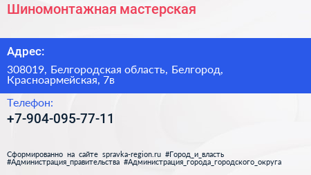 Шиномонтажная мастерская по адресу 308019, Белгородская область, Белгород, Красноармейская, 7в в дальнейшем Организация, размещена в следующих категориях: