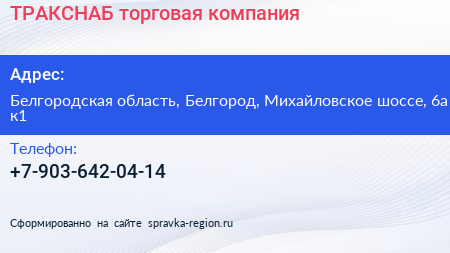 ТРАКСНАБ, торговая компания по адресу Белгородская область, Белгород, Михайловское шоссе, 6а к1 в дальнейшем Организация, размещена в следующих категориях: