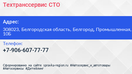 Техтранссервис, СТО по адресу 308023, Белгородская область, Белгород, Промышленная, 10Б в дальнейшем Организация, размещена в следующих категориях: