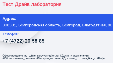 Тест-Драйв, лаборатория по адресу 308501, Белгородская область, Белгород, Благодатная, 80 в дальнейшем Организация, размещена в следующих категориях: