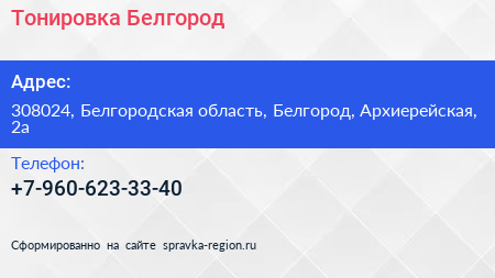 Тонировка-Белгород по адресу 308024, Белгородская область, Белгород, Архиерейская, 2а в дальнейшем Организация, размещена в следующих категориях: