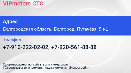 VIPmotors, СТО по адресу Белгородская область, Белгород, Пугачёва, 5 к1 в дальнейшем Организация, размещена в следующих категориях: