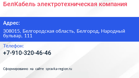БелКабель, электротехническая компания по адресу 308015, Белгородская область, Белгород, Народный бульвар, 111 в дальнейшем Организация, размещена в следующих категориях: