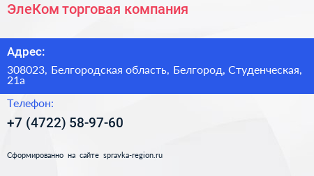 ЭлеКом, торговая компания по адресу 308023, Белгородская область, Белгород, Студенческая, 21а в дальнейшем Организация, размещена в следующих категориях: