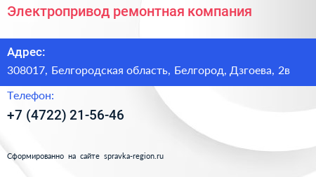 Электропривод, ремонтная компания по адресу 308017, Белгородская область, Белгород, Дзгоева, 2в в дальнейшем Организация, размещена в следующих категориях: