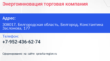 Энергоинновация, торговая компания по адресу 308017, Белгородская область, Белгород, Константина Заслонова, 177 в дальнейшем Организация, размещена в следующих категориях: