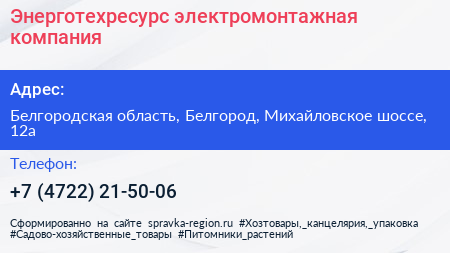 Энерготехресурс, электромонтажная компания по адресу Белгородская область, Белгород, Михайловское шоссе, 12а в дальнейшем Организация, размещена в следующих категориях: