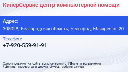 КиперСервис, центр компьютерной помощи по адресу 308029, Белгородская область, Белгород, Макаренко, 20 в дальнейшем Организация, размещена в следующих категориях: