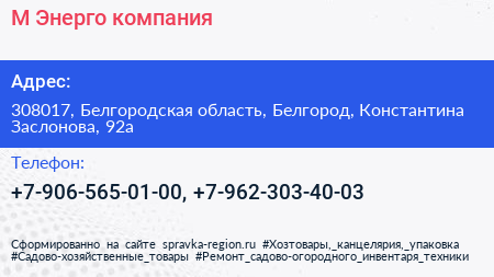 М-Энерго, компания по адресу 308017, Белгородская область, Белгород, Константина Заслонова, 92а в дальнейшем Организация, размещена в следующих категориях:
