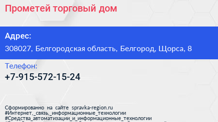 Прометей, торговый дом по адресу 308027, Белгородская область, Белгород, Щорса, 8 в дальнейшем Организация, размещена в следующих категориях: