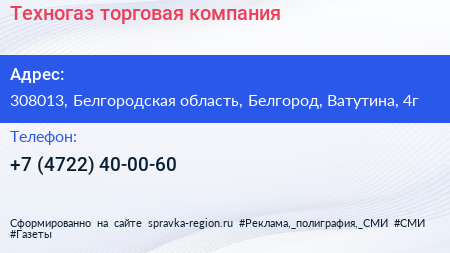 Техногаз, торговая компания по адресу 308013, Белгородская область, Белгород, Ватутина, 4г в дальнейшем Организация, размещена в следующих категориях: