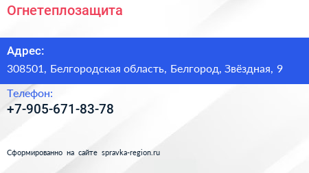 Огнетеплозащита по адресу 308501, Белгородская область, Белгород, Звёздная, 9 в дальнейшем Организация, размещена в следующих категориях: