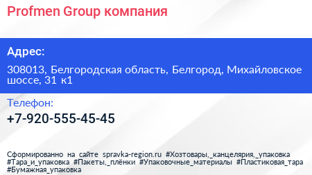 Profmen.Group, компания по адресу 308013, Белгородская область, Белгород, Михайловское шоссе, 31 к1 в дальнейшем Организация, размещена в следующих категориях: