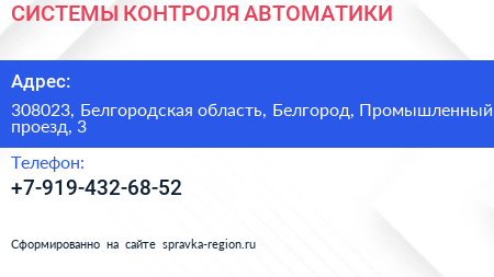 СИСТЕМЫ КОНТРОЛЯ АВТОМАТИКИ по адресу 308023, Белгородская область, Белгород, Промышленный проезд, 3 в дальнейшем Организация, размещена в следующих категориях: