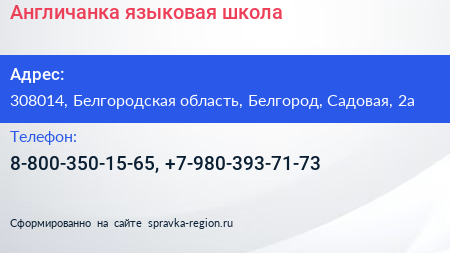 Англичанка, языковая школа по адресу 308014, Белгородская область, Белгород, Садовая, 2а в дальнейшем Организация, размещена в следующих категориях: