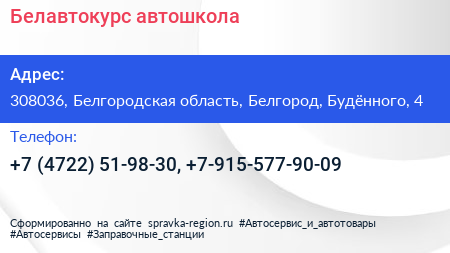 Белавтокурс, автошкола по адресу 308036, Белгородская область, Белгород, Будённого, 4 в дальнейшем Организация, размещена в следующих категориях:
