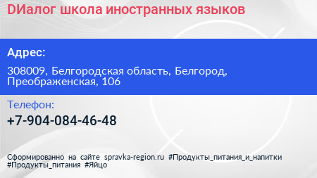 DИалог, школа иностранных языков по адресу 308009, Белгородская область, Белгород, Преображенская, 106 в дальнейшем Организация, размещена в следующих категориях: