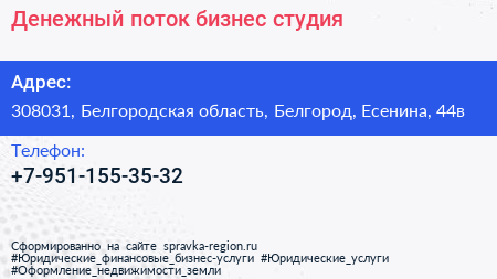 Денежный поток, бизнес-студия по адресу 308031, Белгородская область, Белгород, Есенина, 44в в дальнейшем Организация, размещена в следующих категориях: