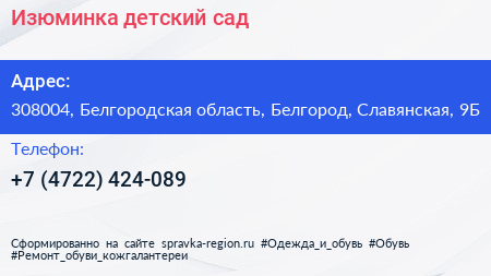 Изюминка, детский сад по адресу 308004, Белгородская область, Белгород, Славянская, 9Б в дальнейшем Организация, размещена в следующих категориях: