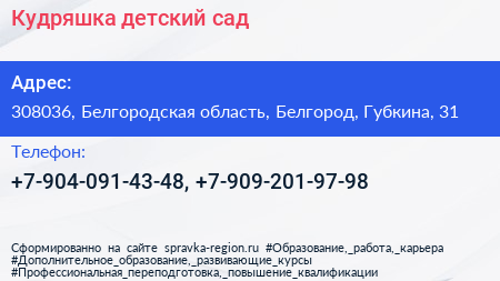 Кудряшка, детский сад по адресу 308036, Белгородская область, Белгород, Губкина, 31 в дальнейшем Организация, размещена в следующих категориях:
