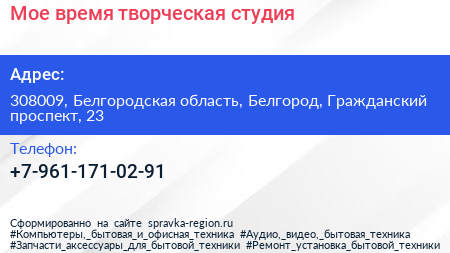 Мое время, творческая студия по адресу 308009, Белгородская область, Белгород, Гражданский проспект, 23 в дальнейшем Организация, размещена в следующих категориях: