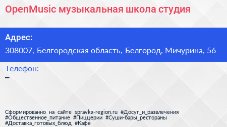 OpenMusic, музыкальная школа-студия по адресу 308007, Белгородская область, Белгород, Мичурина, 56 в дальнейшем Организация, размещена в следующих категориях: