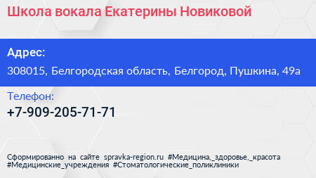 Школа вокала Екатерины Новиковой по адресу 308015, Белгородская область, Белгород, Пушкина, 49а в дальнейшем Организация, размещена в следующих категориях: