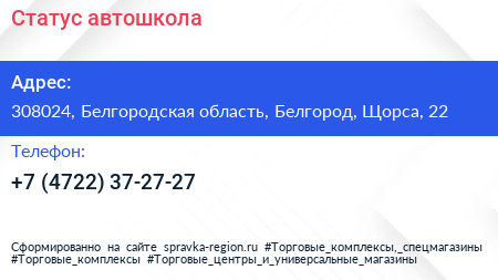 Статус, автошкола по адресу 308024, Белгородская область, Белгород, Щорса, 22 в дальнейшем Организация, размещена в следующих категориях: