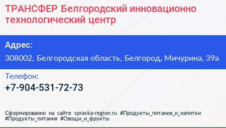ТРАНСФЕР, Белгородский инновационно-технологический центр по адресу 308002, Белгородская область, Белгород, Мичурина, 39а в дальнейшем Организация, размещена в следующих категориях: