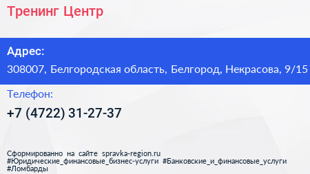 Тренинг-Центр по адресу 308007, Белгородская область, Белгород, Некрасова, 9/15 в дальнейшем Организация, размещена в следующих категориях: