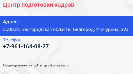 Центр подготовки кадров по адресу 308002, Белгородская область, Белгород, Мичурина, 39а в дальнейшем Организация, размещена в следующих категориях: