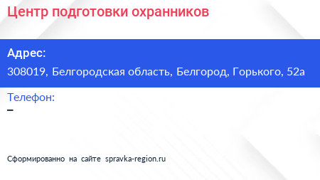 Центр подготовки охранников по адресу 308019, Белгородская область, Белгород, Горького, 52а в дальнейшем Организация, размещена в следующих категориях: