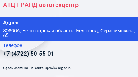 АТЦ ГРАНД, автотехцентр по адресу 308006, Белгородская область, Белгород, Серафимовича, 65 в дальнейшем Организация, размещена в следующих категориях:
