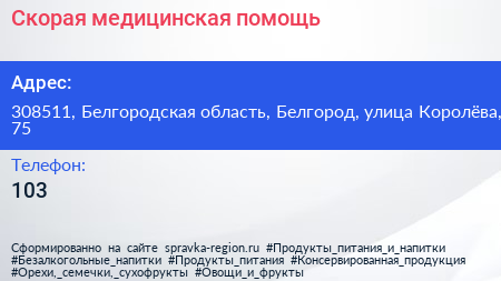 Скорая медицинская помощь по адресу 308511, Белгородская область, Белгород, улица Королёва, 75 в дальнейшем Организация, размещена в следующих категориях: