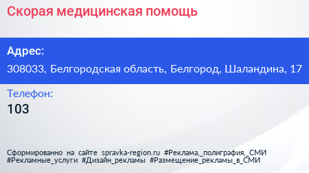 Скорая медицинская помощь по адресу 308033, Белгородская область, Белгород, Шаландина, 17 в дальнейшем Организация, размещена в следующих категориях: