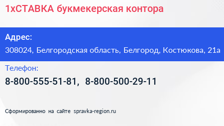 1xСТАВКА, букмекерская контора по адресу 308024, Белгородская область, Белгород, Костюкова, 21а в дальнейшем Организация, размещена в следующих категориях: