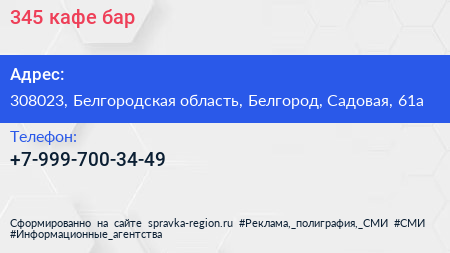 345, кафе-бар по адресу 308023, Белгородская область, Белгород, Садовая, 61а в дальнейшем Организация, размещена в следующих категориях: