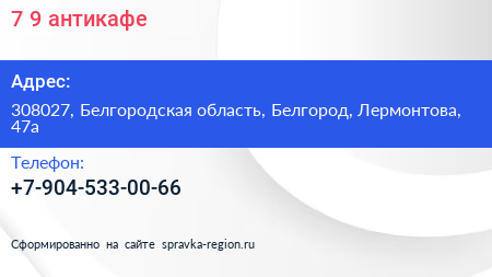 7/9, антикафе по адресу 308027, Белгородская область, Белгород, Лермонтова, 47а в дальнейшем Организация, размещена в следующих категориях: