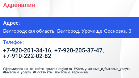 Адреналин по адресу Белгородская область, Белгород, Урочище Сосновка, 3 в дальнейшем Организация, размещена в следующих категориях: