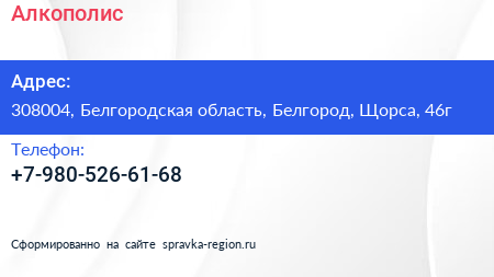 Алкополис по адресу 308004, Белгородская область, Белгород, Щорса, 46г в дальнейшем Организация, размещена в следующих категориях: