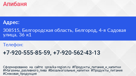 Апибаня по адресу 308515, Белгородская область, Белгород, 4-я Садовая улица, 36 к1 в дальнейшем Организация, размещена в следующих категориях: