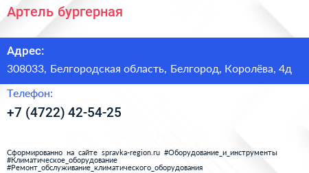 Артель, бургерная по адресу 308033, Белгородская область, Белгород, Королёва, 4д в дальнейшем Организация, размещена в следующих категориях: