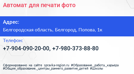 Автомат для печати фото по адресу Белгородская область, Белгород, Попова, 1к в дальнейшем Организация, размещена в следующих категориях: