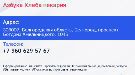 Азбука Хлеба, пекарня по адресу 308007, Белгородская область, Белгород, проспект Богдана Хмельницкого, 104Б в дальнейшем Организация, размещена в следующих категориях: