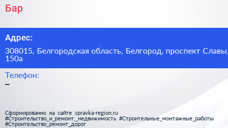 Бар по адресу 308015, Белгородская область, Белгород, проспект Славы, 150а в дальнейшем Организация, размещена в следующих категориях: