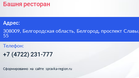 Башня, ресторан по адресу 308009, Белгородская область, Белгород, проспект Славы, 55 в дальнейшем Организация, размещена в следующих категориях: