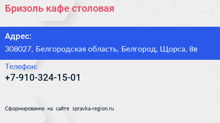 Бризоль, кафе-столовая по адресу 308027, Белгородская область, Белгород, Щорса, 8в в дальнейшем Организация, размещена в следующих категориях: