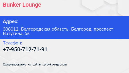 Bunker Lounge по адресу 308012, Белгородская область, Белгород, проспект Ватутина, 5в в дальнейшем Организация, размещена в следующих категориях: