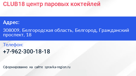 CLUB18, центр паровых коктейлей по адресу 308009, Белгородская область, Белгород, Гражданский проспект, 18 в дальнейшем Организация, размещена в следующих категориях: