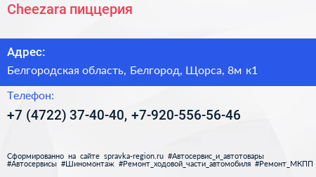 Cheezara, пиццерия по адресу Белгородская область, Белгород, Щорса, 8м к1 в дальнейшем Организация, размещена в следующих категориях: